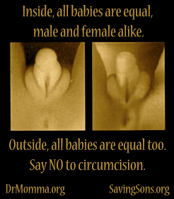 “Do not be afraid of divine punishment. God did not mandate circumcision. In the original version of the Torah, the book of J, circumcision is not even mentioned. Fallible men devised circumcision as a way to curb masturbation. Even Rabbi Maimonides acknowledged this fact.”