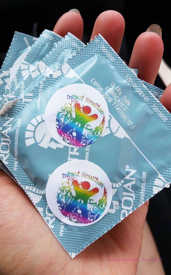 The most popular item we handed out — condom with this sticker (which mentions fabulous foreskin and restoration) on the back and Intact Houston stickers on the front.
