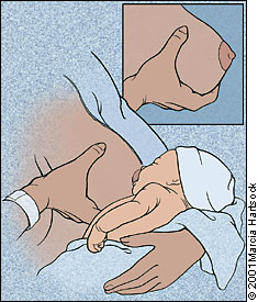 - Bulls-Eye Latch-On: Tickle the baby’s chin and lips to induce the rooting reflex, then use RAM (below) to swiftly bring baby to the breast. The bad news – this technique can make it harder for a baby to draw out the milk because his jaws are too perfectly centered on the target.